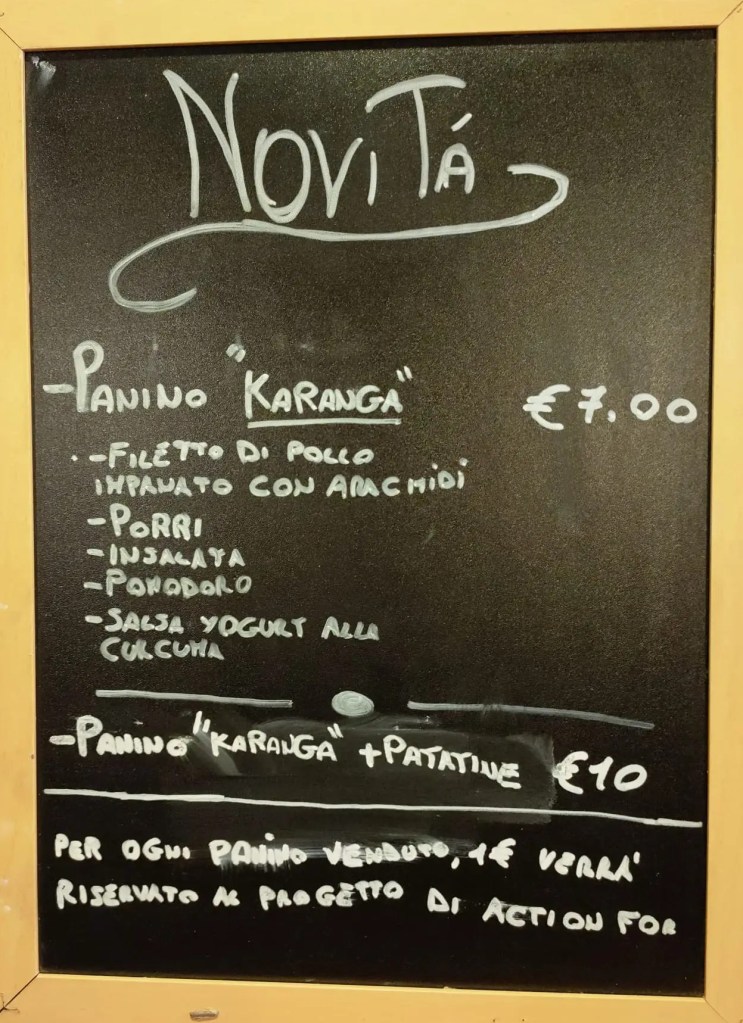 Il Pub, per ognuno di questi panini particolari (pollo con impanatura di arachide: in swhahili karanga) versa un euro ad Action for per i suoi progetti di sostegno alimentare per i bambini e le bambine di Njiru.