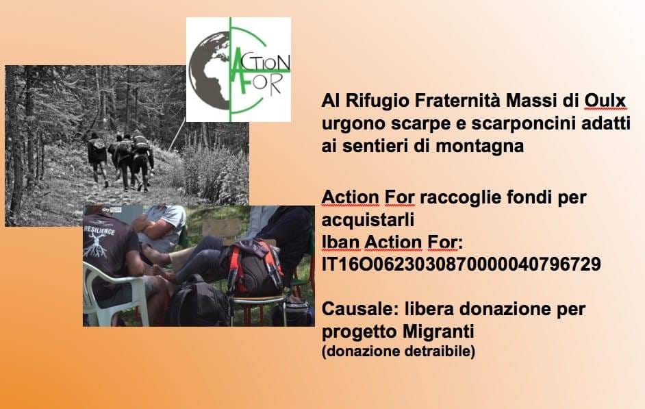 La raccolta dell’usato non sempre è sufficiente a soddisfare le effettive esigenze: insieme alle tante realtà che concorrono a gestire il rifugio Massi di Oulx, Action for raccoglie fondi per poter acquistare quanto necessario per affrontare neve e freddo.